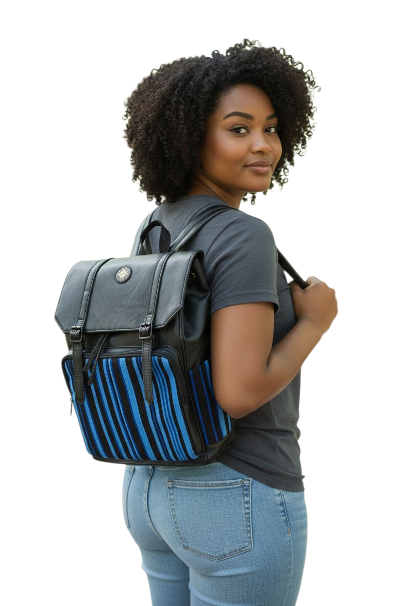 Faites sensation avec le sac à dos Koffi, une pièce très belle et robuste . Ce sac marie à la perfection l’aspect moderne du cuir synthétique avec un pagne tissé à la main du Togo (Kenté).