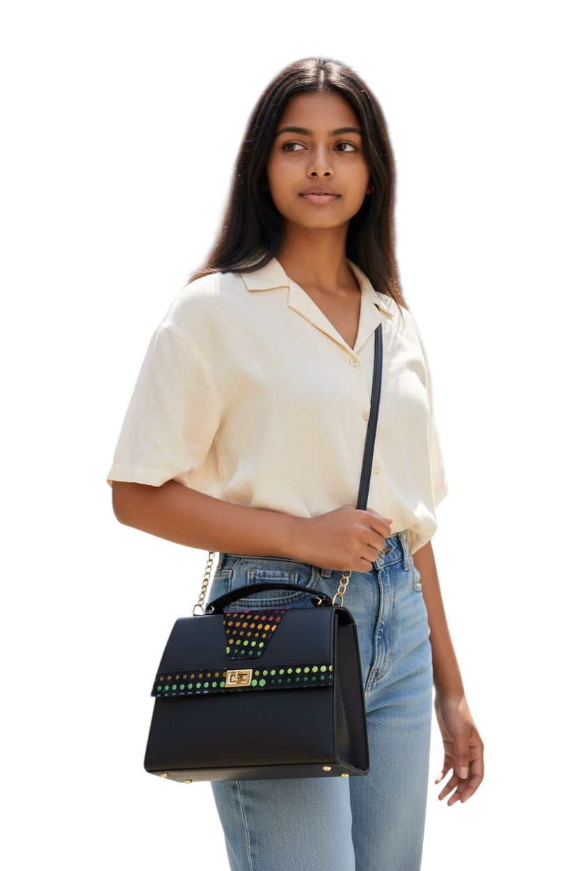 Affirmez votre style avec ce sac à main sophistiqué, sublimé par des motifs magnifiques et un rabat original. Sa forme structurée et ses finitions de qualité en font l’accessoire idéal pour vos sorties, soirées ou journées élégantes.